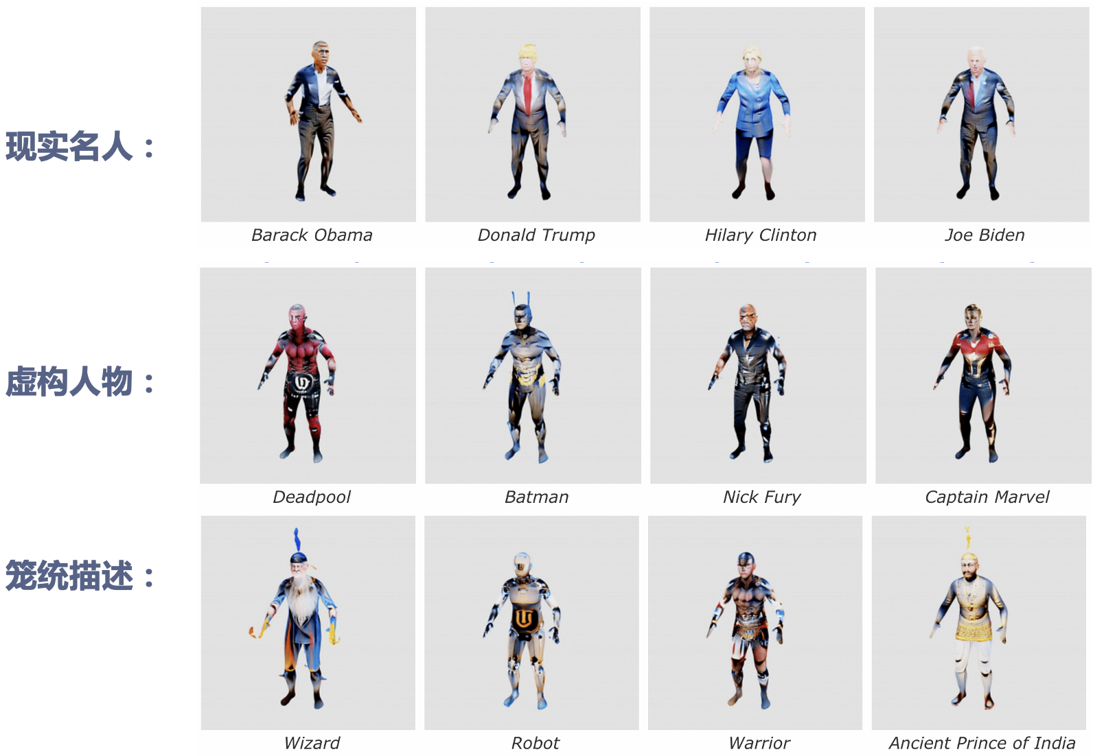 作者用一系列定性定量实验证明了AvatarCLIP在各种零样本虚拟化身生成任务上的有效性和通用性。下图展示了该方法能生成非常广泛的虚拟化身类型(包括真实人物、虚拟人物和笼统描述)。