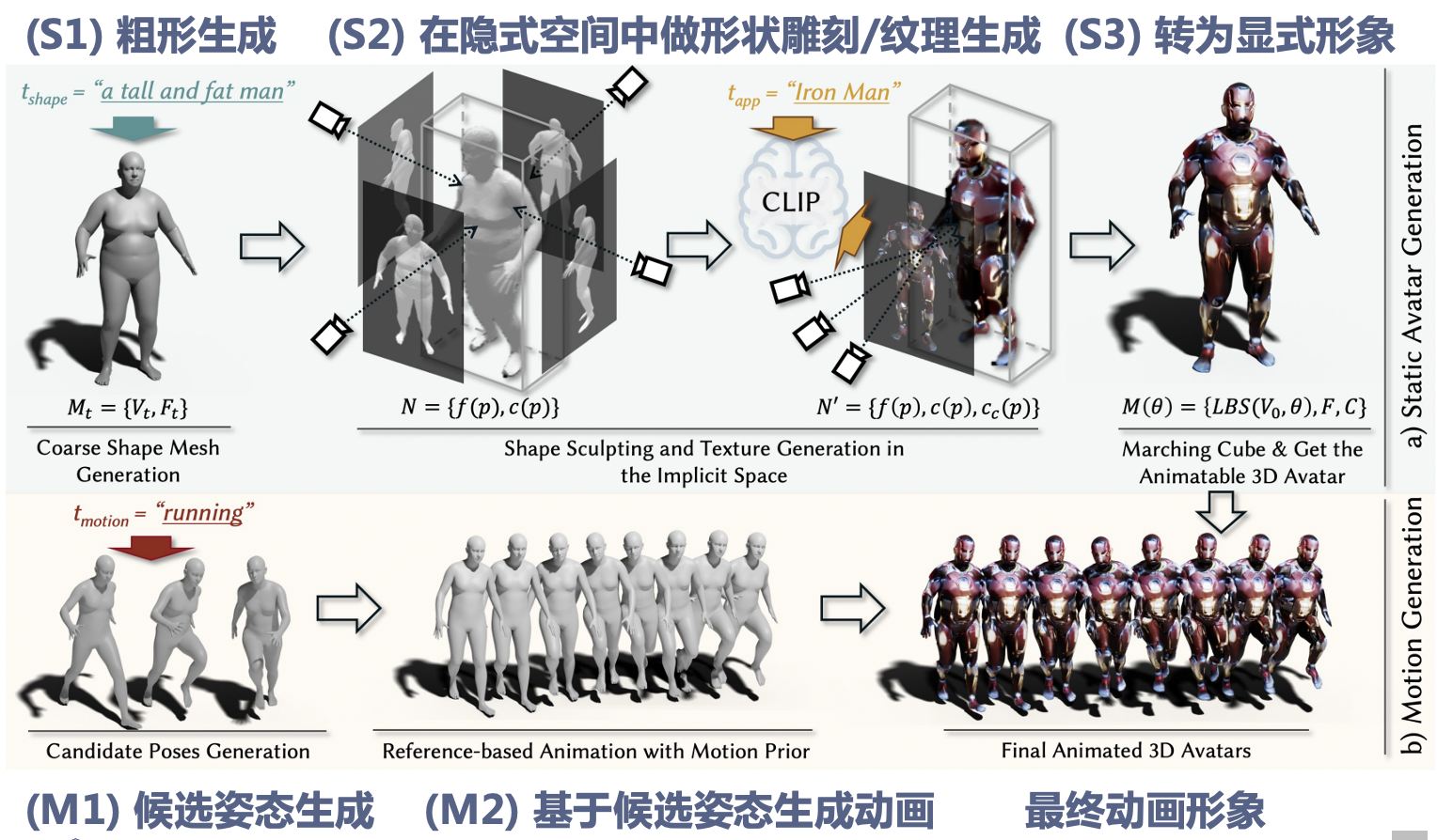 虚拟化身创建的应用也非常广泛,然后创建虚拟化身需要大量的时间和很高的门槛。本文提出了AvatarCLIP,一个利用CLIP模型来实现文本驱动虚拟化身生成及动画的框架。(如下图所示,用户只需要用文本指定体型、外表和动作,就可以创建对应的动态虚拟化身)。