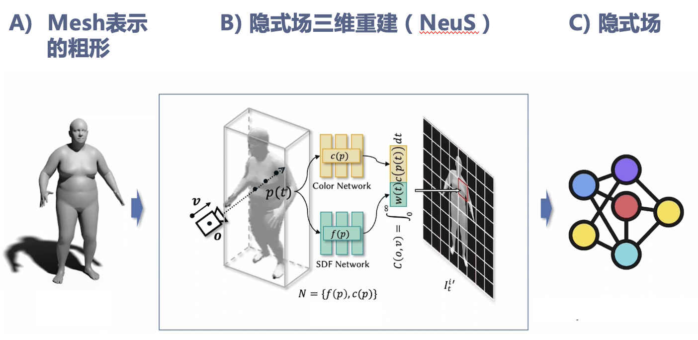 首先通过类似NeRF的三维重建方法在用神经网络表示的隐式场中重建用mesh表示粗糙人体模型。