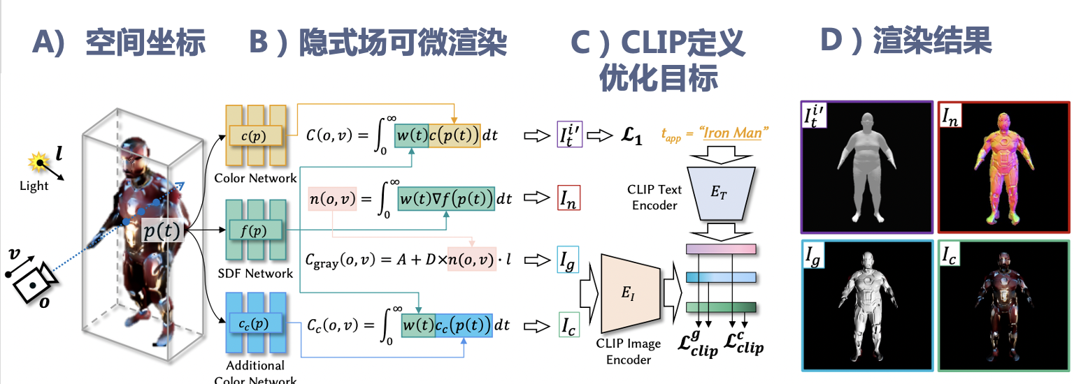 通过可微分渲染得到不同角度的虚拟形象图片,使用CLIP模型来计算这些虚拟形象图片和用户文本描述的差异作为监督损失。由于使用的是可微分渲染器,该监督损失的梯度可以反向传播到表示虚拟形象的隐式场,从而实现符合文本描述的形状雕刻和纹理生成。