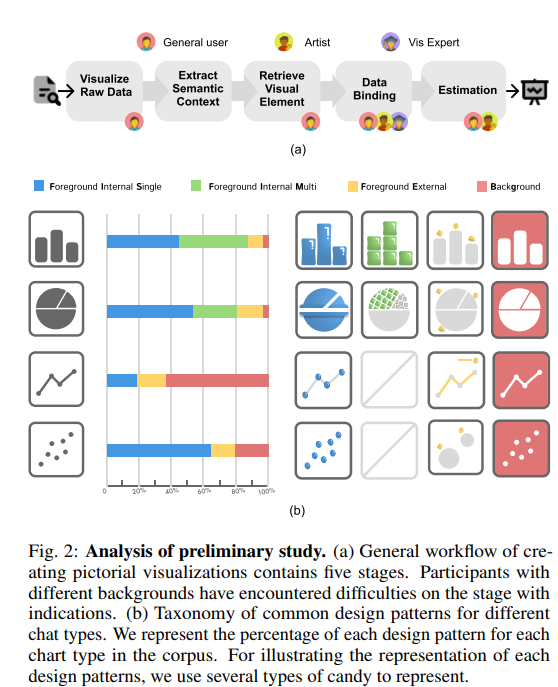 在当今数据丰富的世界中,可视化技术对于有效展示复杂数据至关重要。图像化可视化尤为宝贵,提供了增强记忆回忆、用户参与度以及高效信息获取等好处。尽管其在各个领域得到了广泛应用,但创建有效的可视化需要设计专业知识,这对新手来说常常是个挑战。为此,已经开发了一些辅助用户的创作工具,通常分为基于规则的和基于示例的两大类。但这两种方法都有其局限性,如僵化或需要大量示例。