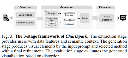 ChartSpark 的 3 阶段框架。提取阶段为用户提供数据特征和语义上下文。生成阶段通过输入提示和选定的方法生成视觉元素,并进行最终优化。评估阶段根据失真评估生成的可视化效果。