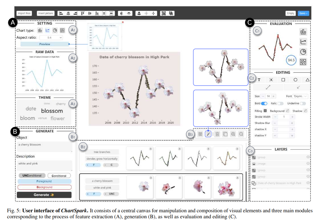我们介绍了ChartSpark,这是一个新的工具,它将文本到图像的生成模型整合用于创建图像化可视化。它从文本中提取可视化对象,并根据用户提供的描述指导生成。ChartSpark将对象分为前景和背景,并提供条件和非条件的生成方法。这种方法简化了可视化过程,相比传统方法在易用性、灵活性以及将语义信息与视觉数据自然结合方面具有优势。