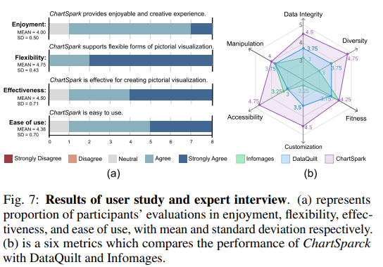 实际应用和评估:通过展示覆盖图像化可视化四大主要形式的案例,作者有效地评估了ChartSpark的实用性。用户研究和专家访谈的反馈提供了实证支持,证明了这个框架的有效性。