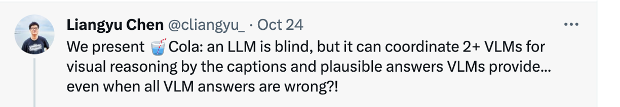 • Cola:一种新颖的范例,利用语言模型作为多个视觉语言模型之间的协调者,整合它们各自的优势进行视觉推理。