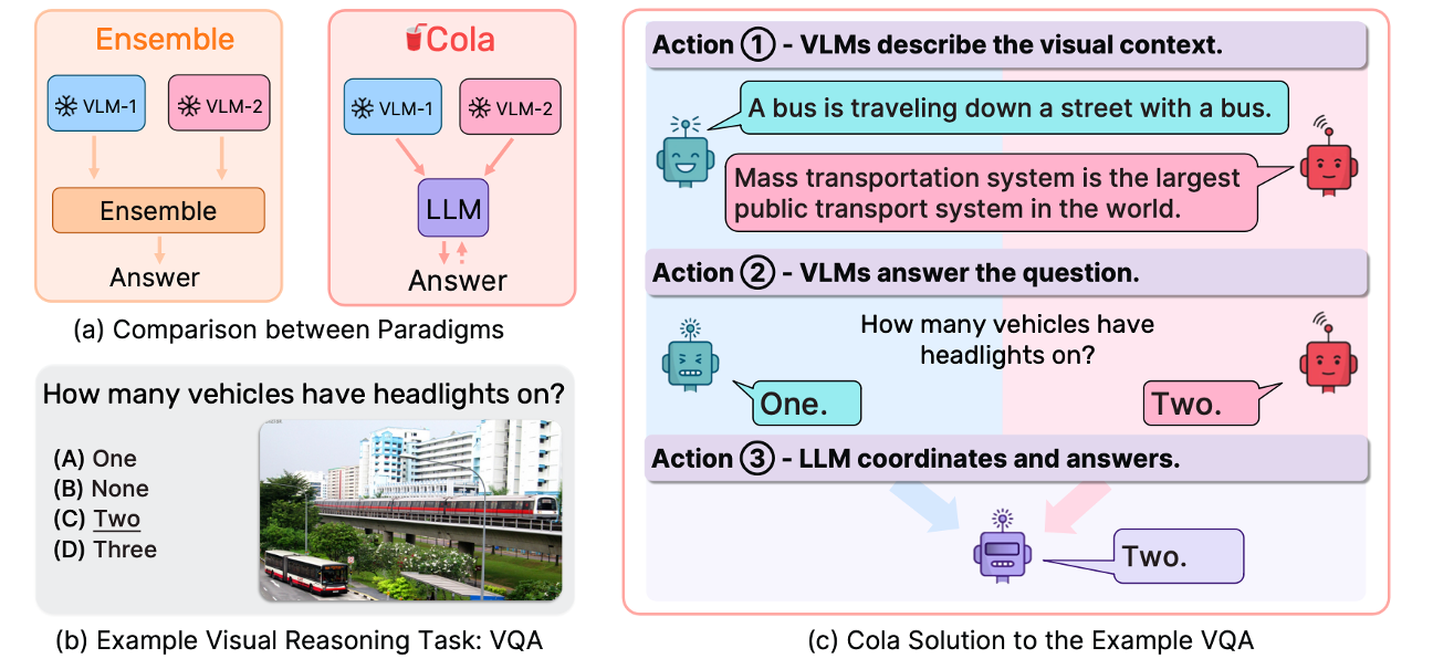 然而,如何利用这些互补视觉语言模型的集体力量却鲜有人问津。现有的方法(如集合)仍难以将这些模型与所需的高阶通信聚合在一起。本文提出了一种协调多个 VLM 进行视觉推理的新范式—Cola。大型语言模型(LLM)可以通过促进自然语言交流来有效协调多个 VLM,从而利用它们各自不同的互补能力。