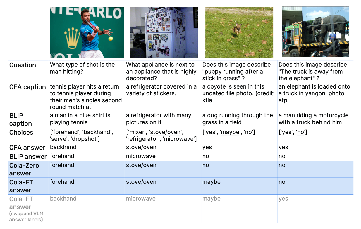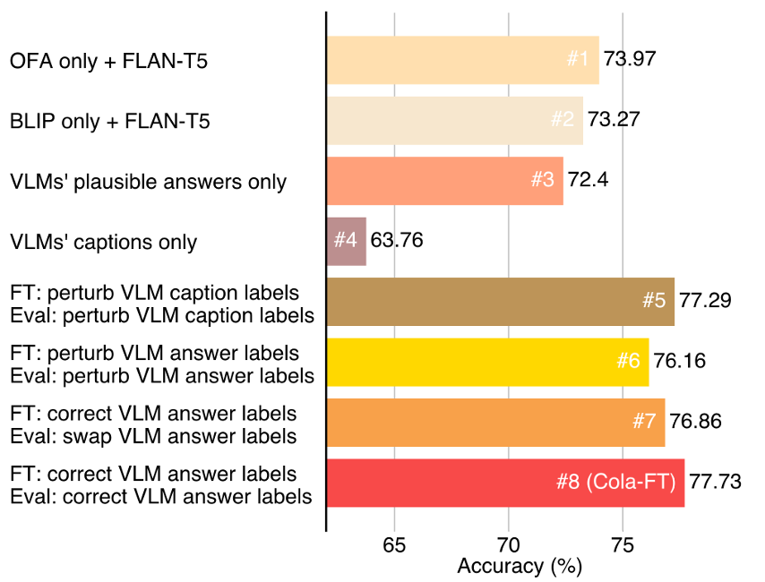 随后的实验中,作者剔除了VLM的标题和合理答案,以及通过扰动标题标签等方式进行了关键验证步骤。实验证明,合理的答案对于帮助语言模型回答视觉问题更为重要。通过扰动VLM标题标签,作者验证了这些标签对Cola-FT性能的影响,结果显示VLM标题标签的变化会降低Cola-FT的性能。总体而言,作者强调Cola模型性能的提升主要来自于BLIP和OFA之间的协作,而非语言模型FLAN-T5的强大推理能力。