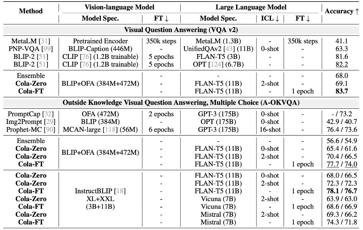 实验证明,指令微调变体 Cola-FT 在视觉问题解答 (VQA)等一系列推理任务上取得了SOTA。此外还证明了上下文学习变体 Cola-Zero,在不进行微调的情况下,也表现出了极具竞争力的性能。