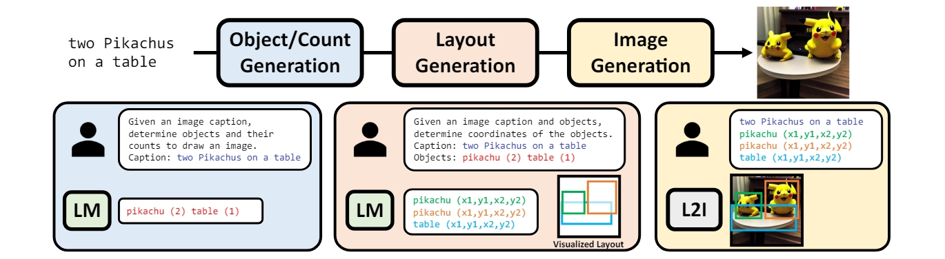 Bridging text-to-image generation with layouts.一条研究路线将T2I生成任务分解为两个阶段:文本到布局生成和布局到图像生成。然而,先前的方法通过从头开始训练新的布局预测器模块来关注一组预定义的对象类,因此不能在训练期间加入新对象。作者提出的VPGEN使用LM通过在文本中生成对象/计数/位置来处理布局生成,允许灵活地适应可以理解不同区域描述的预训练LM。