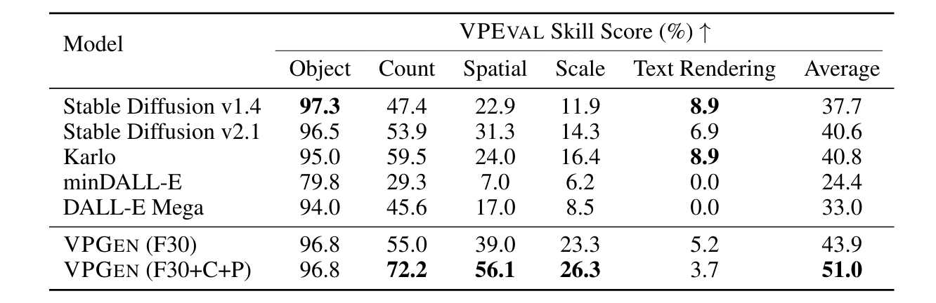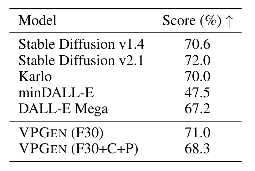 扩散模型优于多模态LM。在表1中,作者展示了每个模型的VPEVAL技能精度。扩散模型(Stable Diffusion、Karlo和本文提出的VPGEN)显示出比多模态LM(minDALL-E和DALL-E Mega)更高的总体准确性。