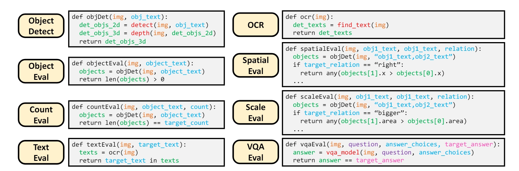 为了衡量上节所述的技能。作者使用八个专门用于不同任务的专家视觉评估模块。这些模块提供了视觉+文本的解释与他们的分数。通过在图像上渲染边界框来生成视觉解释,并且通过文本模板来生成文本解释,如图2和图4所示。作者在图3中提供了每个模块的Python伪代码实现。