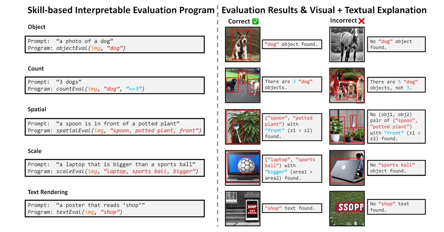 VPEVAL 是一个基于视觉编程的用于 T2I 生成模型的可解释/可说明评估框架。与使用端到端模型计算图像-文本对齐分数的现有T2I评估方法不同,作者的评估为评估结果提供了可解释的程序和视觉+文本解释,如图2和图4。作者提出了两种类型的评价提示:(1)基于技能的评价和(2)开放式评价。在基于技能的评估中,作者定义了五种图像生成技能,并使用一组特定于技能的提示和评估程序,如图3所示。在开放式评估中,作者使用了一组不同的提示,需要多种图像生成技能。作者采用一种语言模型来动态地为每个文本提示生成一个评估程序,如图4所示。