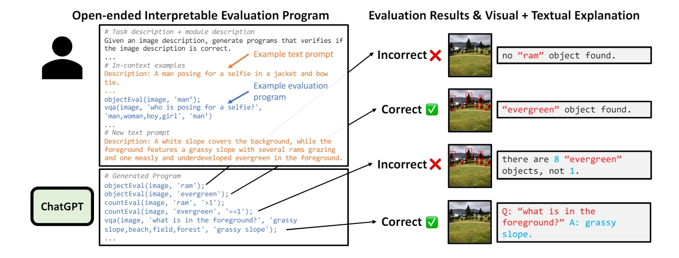 通过上下文学习生成评估程序。由于带有开放式提示的评估程序的注释可能成本高昂,作者使用ChatGPT(GPT-3.5-Turbo)通过上下文学习生成评估程序。为了引导ChatGPT,作者调整了TIFA的12个上下文提示。作者向ChatGPT展示了视觉模块列表以及示例文本提示和程序,然后请求模型在给定新提示的情况下生成程序,如图4所示。