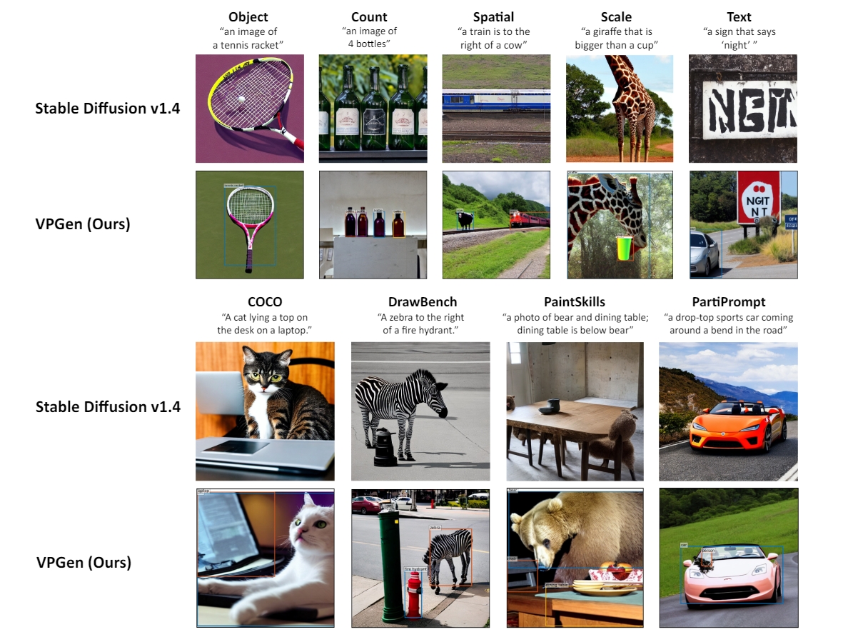 Stable Diffusion v1.4是与VPGEN最具可比性的baseline,因为VPGEN中的GLIGEN使用冻结的Stable Diffusion v1.4以及一些新插入的适配器参数进行空间控制。