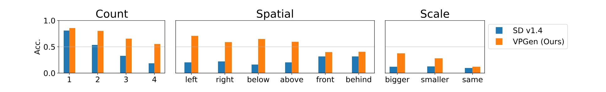 计数/空间/规模技能中的细粒度分析。为了更好地了解作者的VPGEN在计数,空间和缩放技能方面的高性能,作者使用细粒度分割对这些技能进行了详细分析。在图5中,作者比较了作者的VPGEN(Vicuna+GLIGEN)及其最接近的基线Stable Diffusion v1.4在三个技能上的表现。总的来说:VPGEN在所有三个技能上的每一个技能上都比Stable Diffusion取得了更好的性能。计数:虽然这两种模型在计算较大数字时都存在困难,但作者的VPGEN模型在所有四个数字上都实现了50+的准确度。空间:作者的VPGEN模型在所有六个空间关系上都表现得更好。VPGEN在2D关系(左/右/下/上)上显示出比3D深度关系(前/后)更高的准确性,而Stable Diffusion在3D关系上比2D关系更好。规模:与两个大小相似(相同)的对象相比,VPGEN使用两个大小不同(更大/更小)的对象生成更准确的布局。