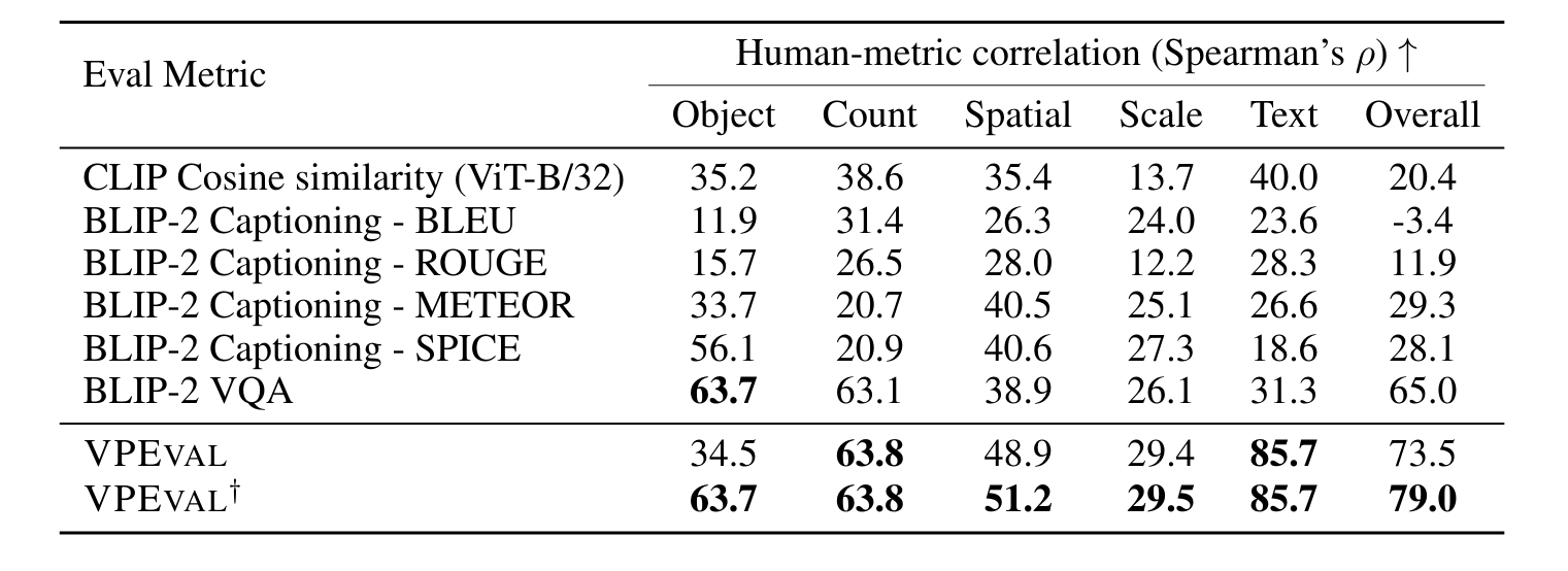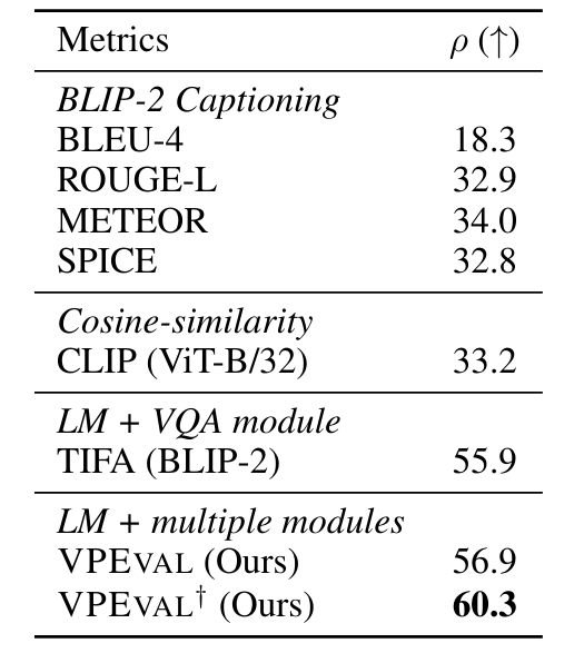 在表3中,作者的VPEVAL显示出与人类判断的总体相关性(66.6)高于基于单个模块的评估(CLIP,Captioning和VQA)。关于每个技能的相关性,VPEVAL在计数和文本渲染中显示出特别强的人类相关性。由于BLIP-2 VQA模块在对象/空间/尺度上也显示出很强的相关性,作者还对VPEVAL进行了实验:对objectEval/spatialEval/scaleEval模块使用BLIP-2 VQA(而不是Grounding DINO和DPT),这增加了人类相关性得分。