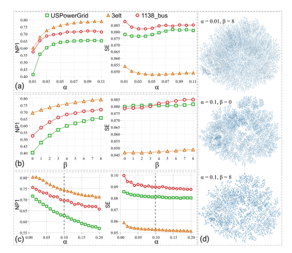 下图(d),α和β在不同值下的布局效果,其中最上面的图具有更加均匀的全局结构,最下面的图保留了更多的邻域结构