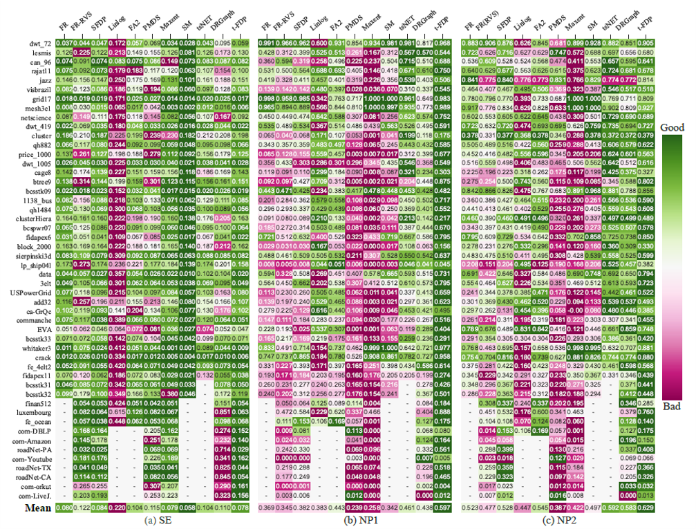 • 最新的基于邻域嵌入的图布局算法tsNET可以比较好地保留2环邻域结构,但其应力误差(stress error)比较大,且不能有效保留1环邻域结构