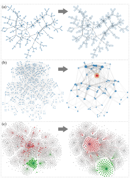 全局调整:可以通过增加斥力让节点分布更均匀(a),或减少斥力来聚集节点以显示主体结构(b)