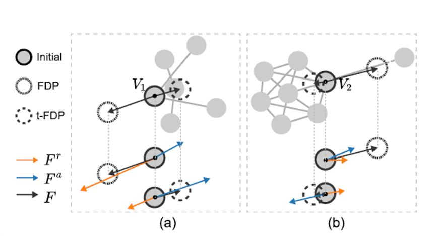 • P3:有边连接的节点相较于没有边连接的节点,有边连接的节点应该更近传统的基于spring-electric的力导布局算法