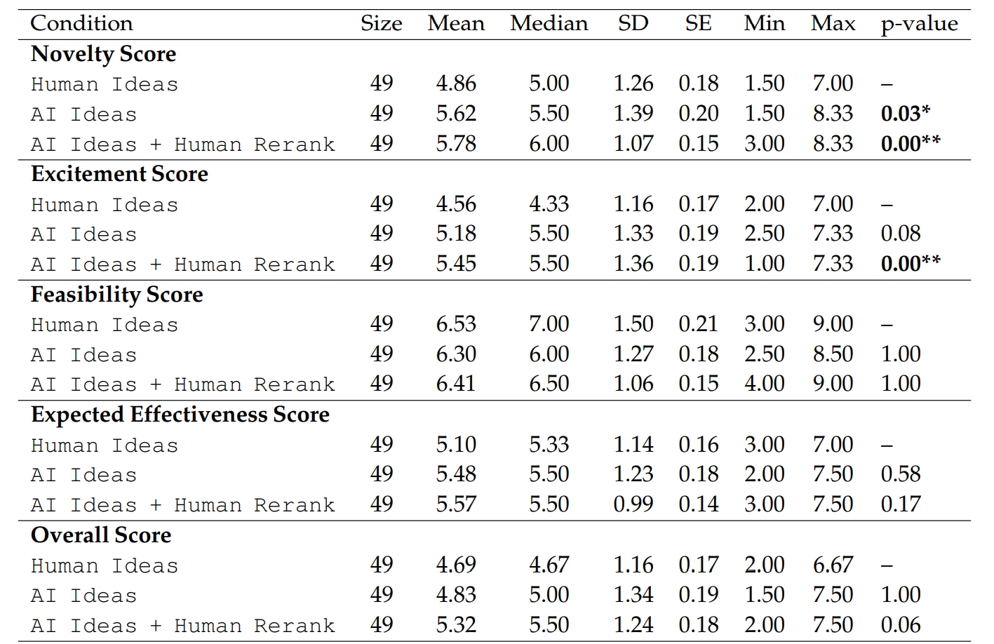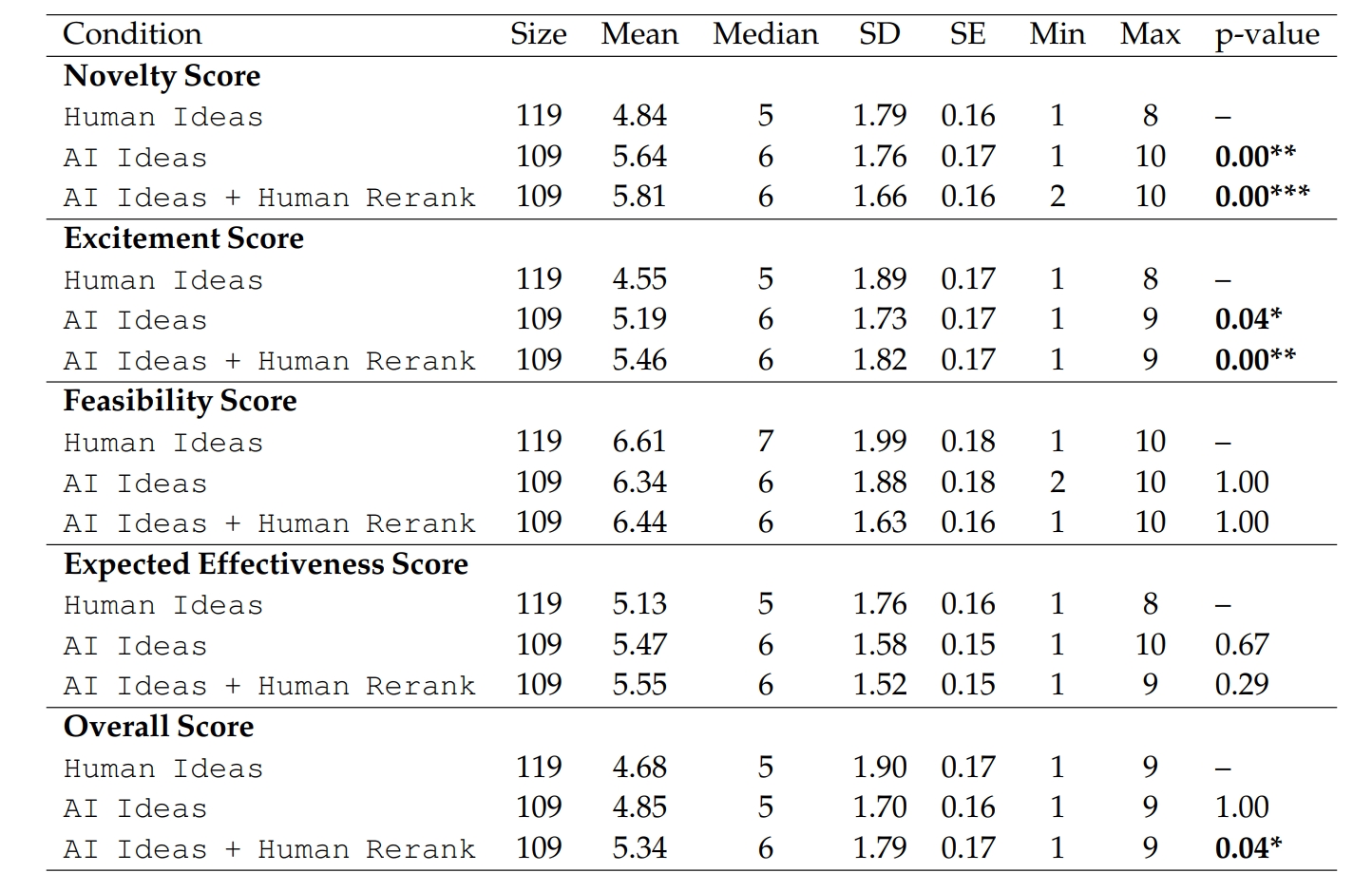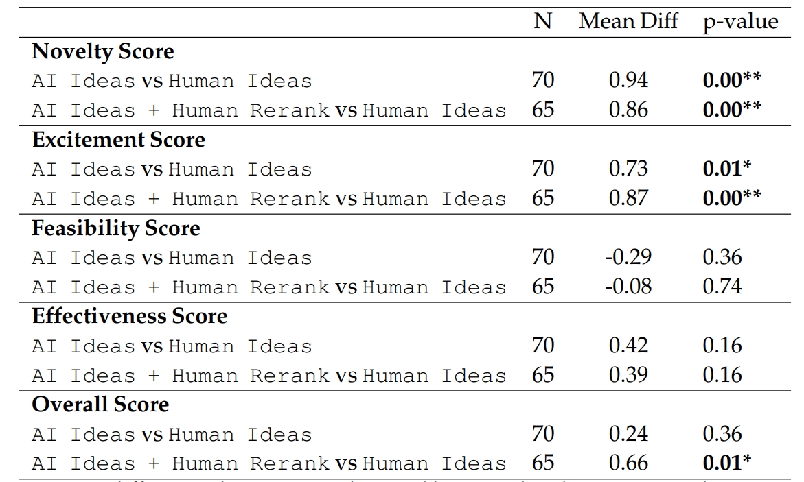 由于作者为每个idea收集了多个审查,有人可能会认为作者不应该将每个审查视为一个独立数据点。为了解决这一潜在的混杂因素,作者进行了测试2,其中作者将每个idea的分数平均,并将其视为一个数据点。这样,每个条件下的样本量将是N=49,即idea的数量。作者将人类idea作为基线条件,并使用双尾Welch’s t-test和Bonferroni校正与AI idea和AI idea+人类重新排名进行比较。如表10所示,作者仍然看到显著的结果(p<0.05),AI idea(µ=5.62 ±σ=1.39)和AI idea+人类重新排名(µ=5.78 ±σ=1.07)的新颖性评分高于人类idea(µ=4.86 ±σ=1.26)。